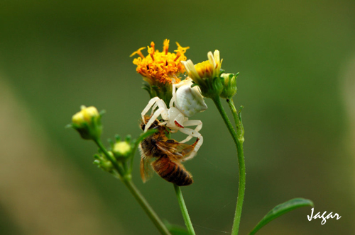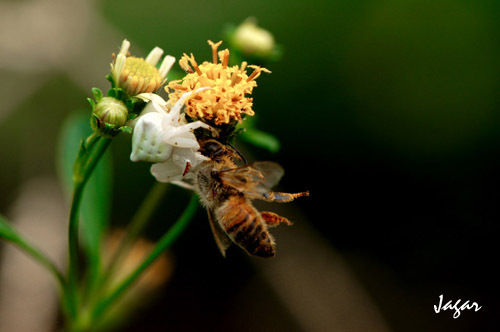 <span><br />響應<a href="http://blog.pixnet.net/una416/post/13850098">una416</a>與<font face="Arial"><a href="http://blog.pixnet.net/JonNDHU">JonNDHU</a></font>所發起網路攝影展「動靜之間」<br /><br />----------------------------------------------這是分格線----------------------------------------------<br /><br />蜜蜂飛快的在花叢間尋找食物<br />蜘蛛靜靜的偽裝等待獵殺<br />這二者的動靜之間<br />都是為了生存<br /></span><br /><img src="http://pic.pimg.tw/jagar/1201921926.jpg" /><br /><!-- more --><img src="http://pic.pimg.tw/jagar/1201921927.jpg" /><br /><br /><img src="http://pic.pimg.tw/jagar/1201921928.jpg" /><br /><br /><img src="http://pic.pimg.tw/jagar/1201921929.jpg" />